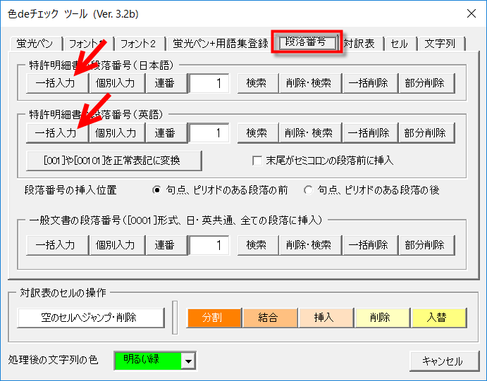 色deチェックで特許明細書の対訳表を作成するには、ご存じの通り段落番号が必要です。
