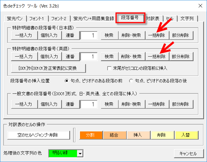 チェックが終わったら訳文から段落番号を削除してください。色deチェックの段落番号の削除機能を使ってください。