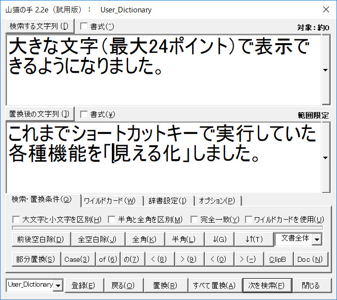[検索と置換]ダイアログボックスの強化版であり、一括置換翻訳の必須ツール「山猫の手」をアップデートしました。ユーザーの方は無料で更新できます。お試しください。