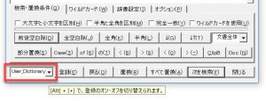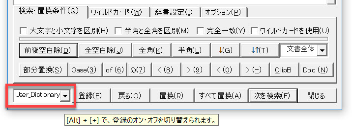 [Alt] + [+] で、置換時の辞書登録のオン・オフを切り替えられます。