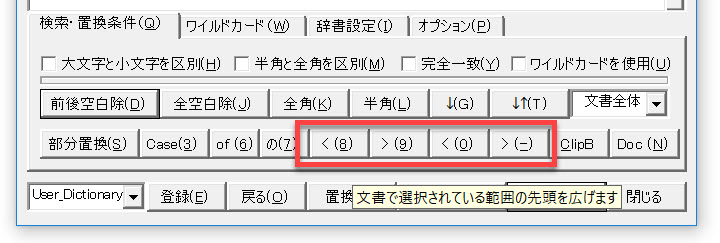 [Alt] + [8] で選択範囲の左端を左方向に単語単位で拡大します。[Alt] + [9] で、選択範囲の左端を右方向に単語単位で縮小します。