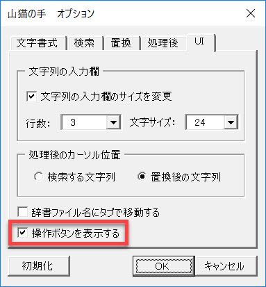 これら操作ボタンを隠す場合には、[オプション]タブから開く以下のボタンをオフにしてください。