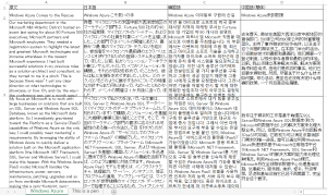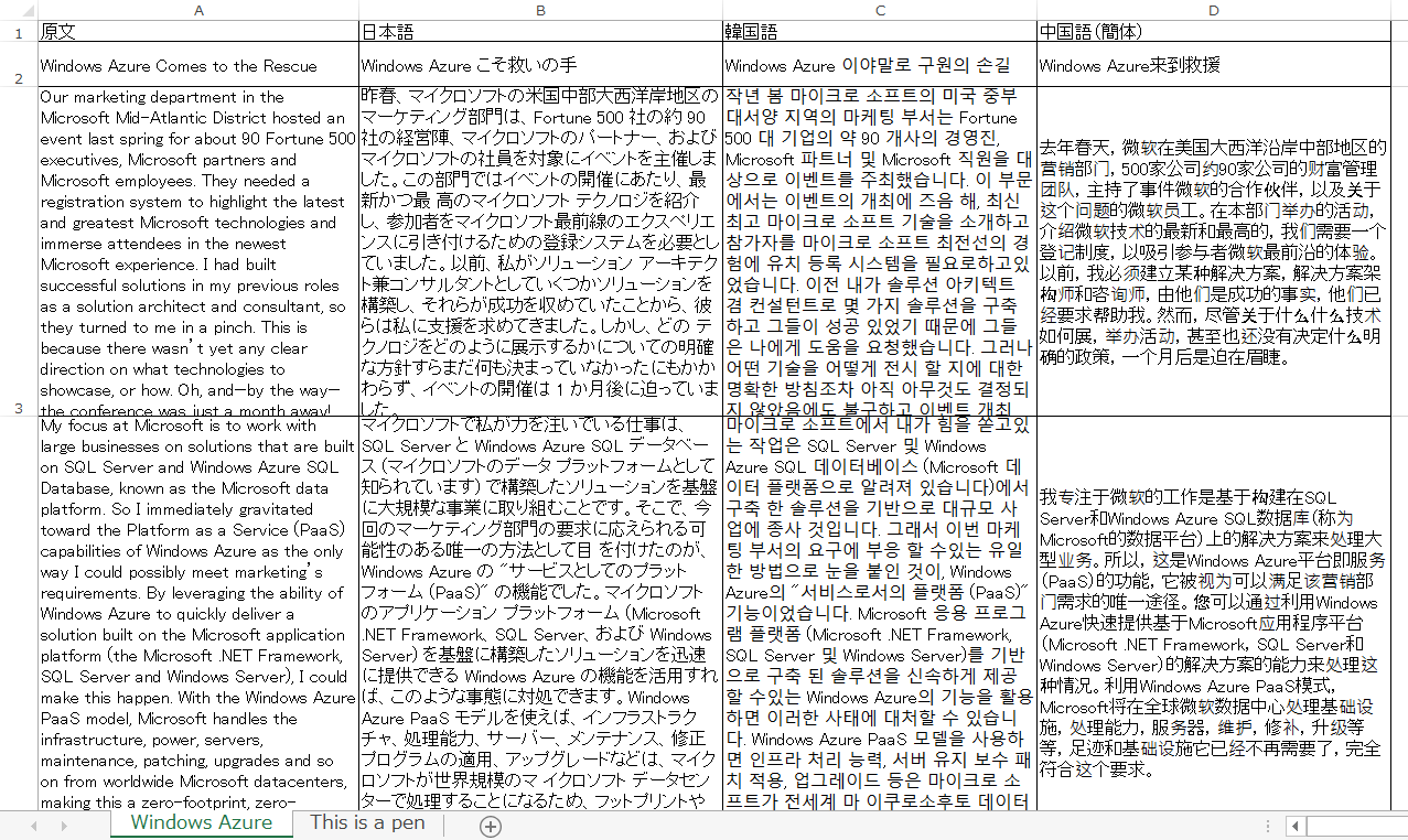 Excelの1シートに複数列があり原文に対して複数の言語で訳文が書かれています。以下のようなファイルを想定しています。