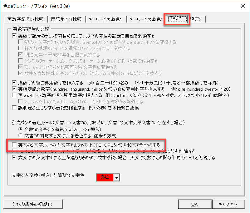 色deチェックでは、上記のチェックをする機能のオン・オフを任意に設定できるようになっており、これがオンになると冒頭のような誤判定の原因になるのです。