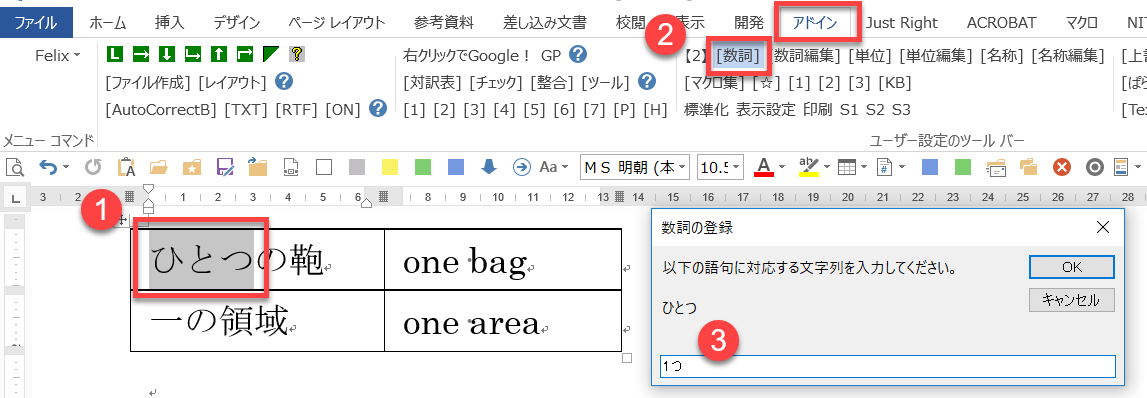 数詞をチェック前に特定の言葉で置換するようにユーザー定義ファイルに定義をします。