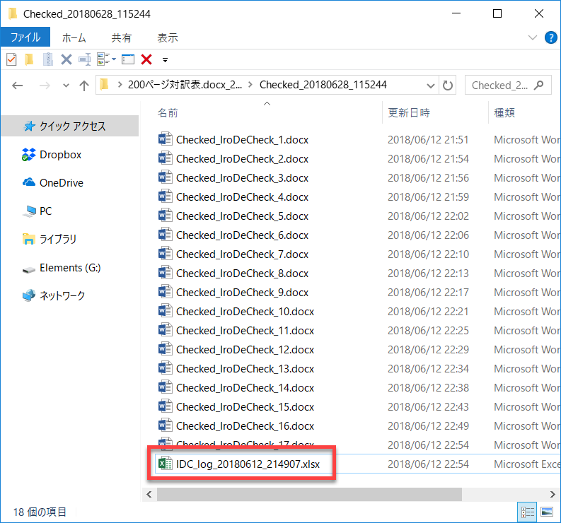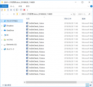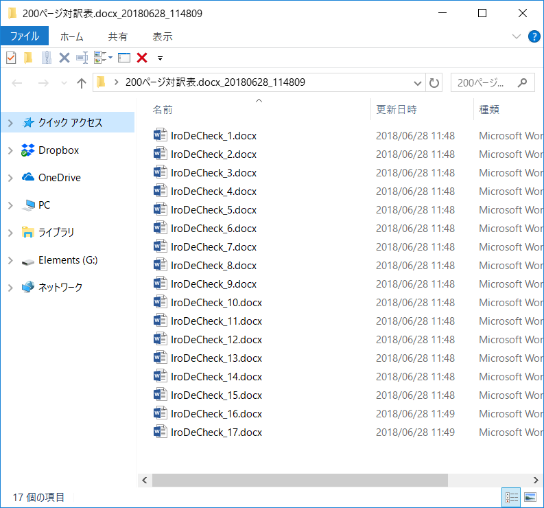 「保存用フォルダ」内に以下のように17つの分割ファイルが保存されました。分割ファイルの名称は、「IroDeCheck_1.docx」、「IroDeCheck_2.docx」、、、、となります。