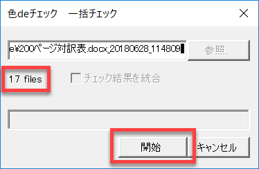 左上に17ファイルが保存されていることが表示されています。[開始]ボタンをクリックすると、1つ1つファイルを開いてチェックを実行します。