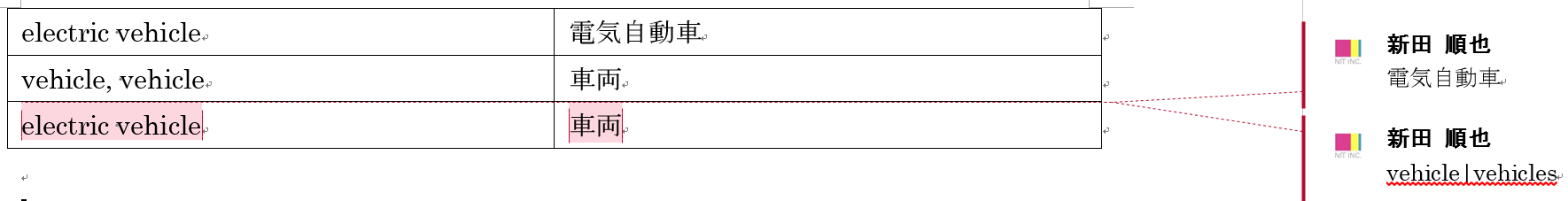 双方向でチェックをすると以下のような結果になります。コメントに、正しい用語(訳語、原語)を表示します。