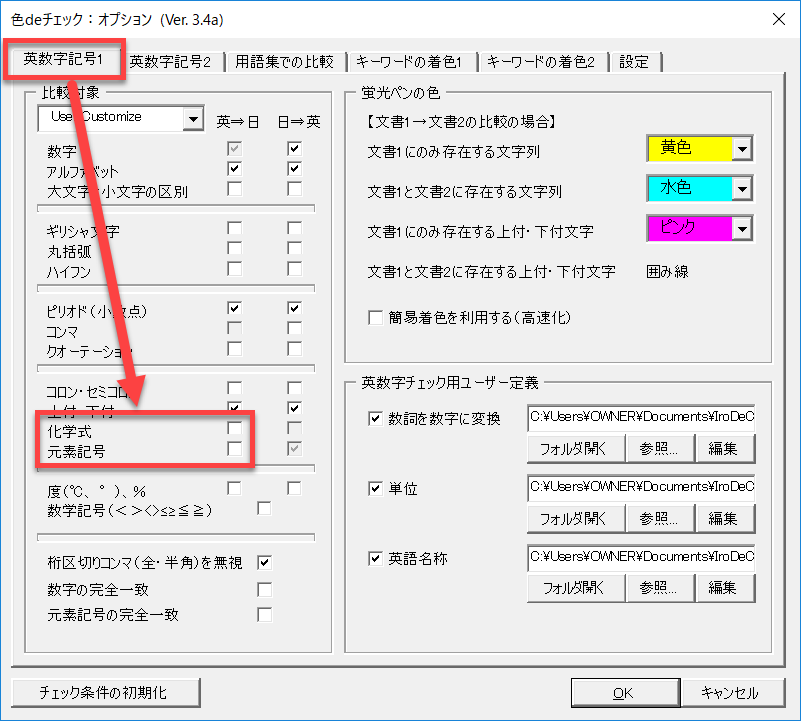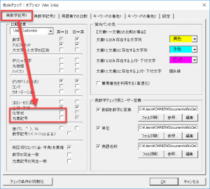 英数字記号のチェック対象として、化学式や元素記号をオンにします。この場合、英文中のアルファベットだけの文字列でも化学式や元素記号であればチェックできます。
