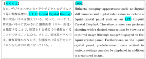 原文ではLCDやLiquidなどアルファベットが水色になっています。英文中に対応する文字列があるため着色されたのです。(参考:【色deチェック】英数字記号のチェック時の蛍光ペンの着色ルールチェックでの水色や黄色の違いを動画で解説