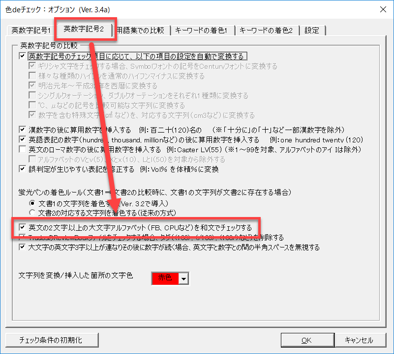 [オプション]ダイアログ[英数字記号2]タブ[英文の2文字以上の大文字アルファベット(FB、CPUなど)を和文でチェックする]チェックボックスをオンにします。
