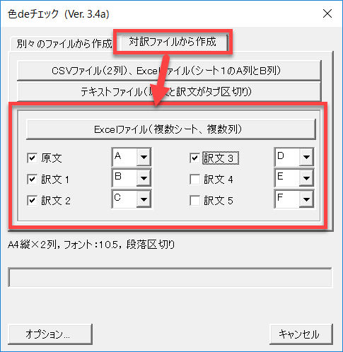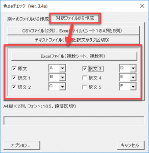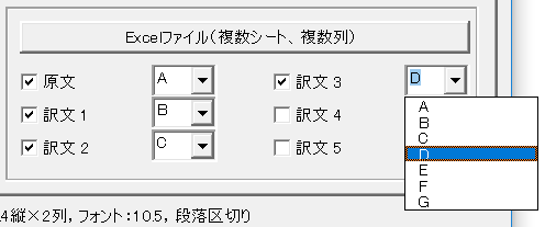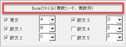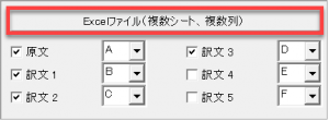 以下の例では、原文をA列、訳文をB列からD列に設定しました。チェックが入っている列のみを対象にします。