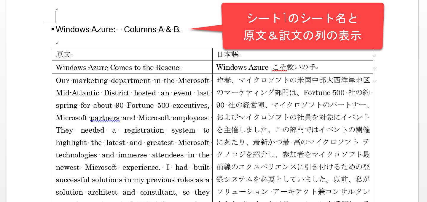 シート1には、「Windows Azure」の対訳表がありシート2には「This is a pen」の対訳表があります。