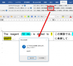 黄色になってしまった単位を選択し(英文中でも和文中でもどちらでもかまいません)、ツールバー【2】の[単位]ボタンをクリックします。