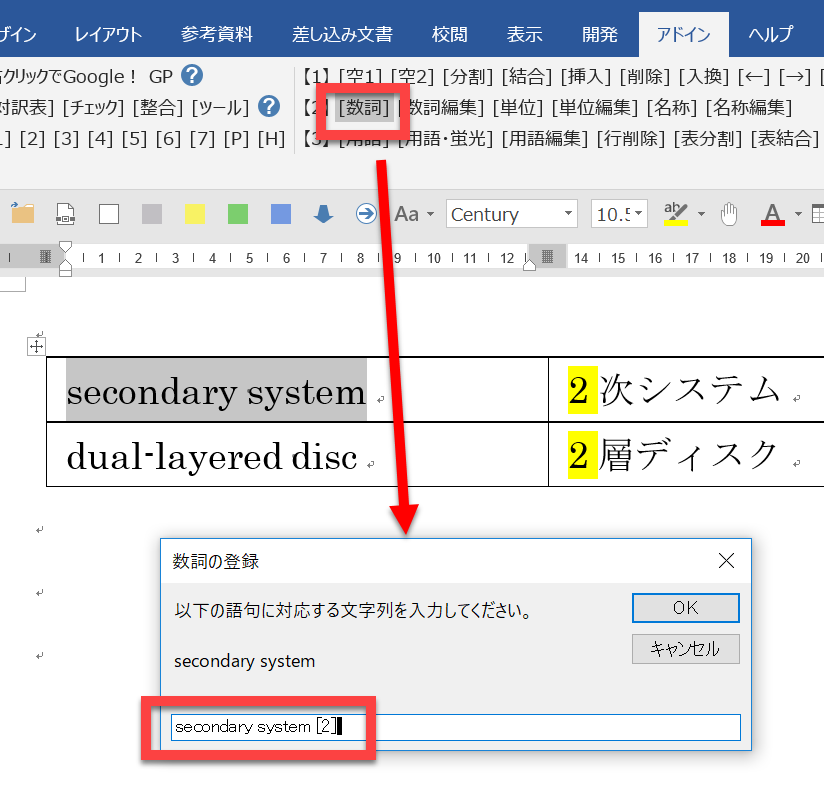 登録する数字を選択してツールバー【2】の[数詞]ボタンをクリックします。