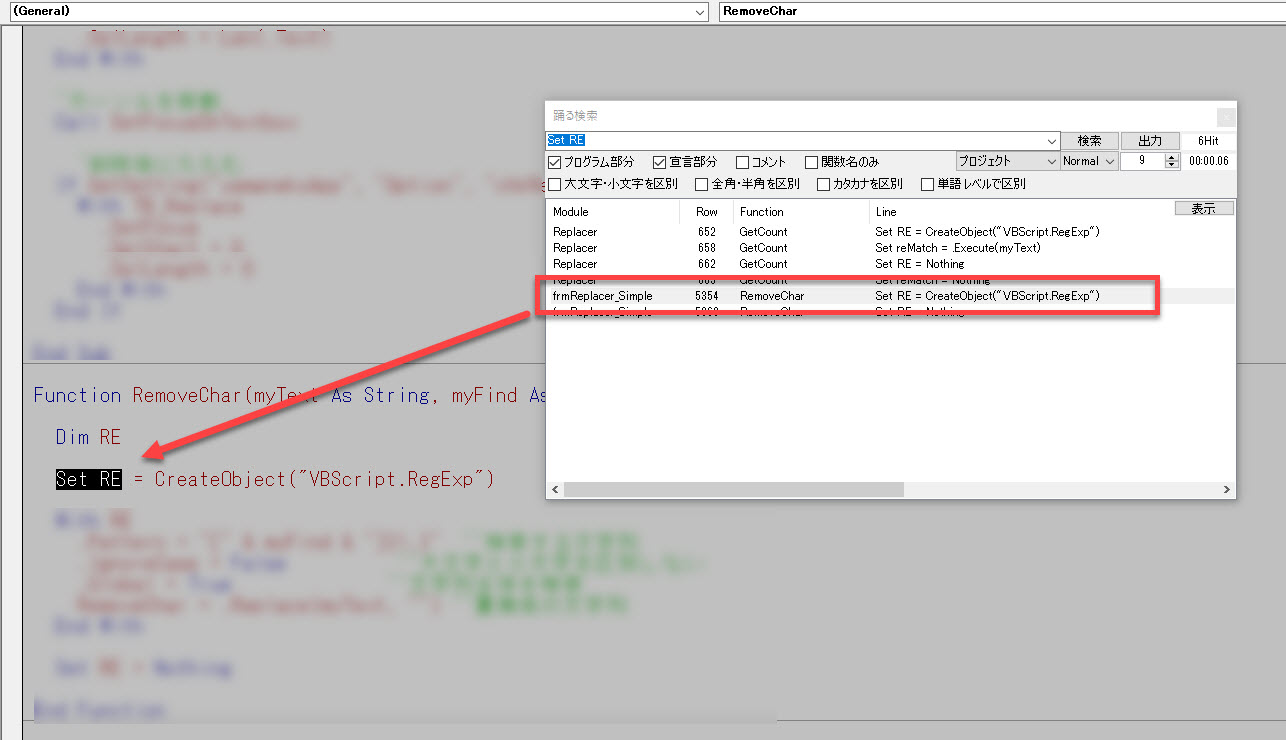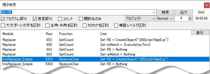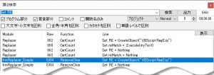 対象箇所がモジュール別に列挙されて、使用されているプロシージャー名やさらにどのような記述でキーワードが使われているのかも表示されています。