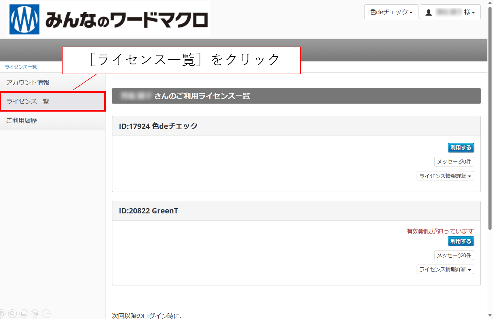 みんなのワードマクロのサービスをご利用のみなさまは、以下のサービスをご利用できます。 利用できるサービス サブスクリプションの解約 ライセンスコードの確認 領収書発行サービス ログイン方法 画面右上の ...