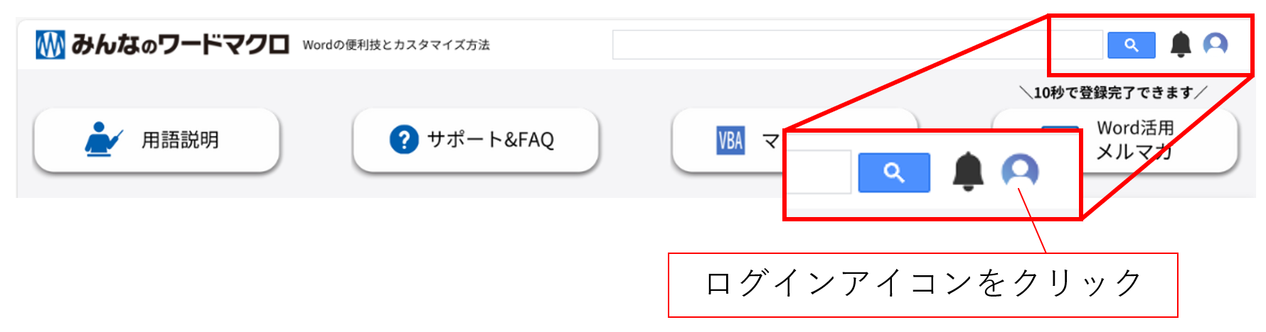 画面右上の隅にあるログインアイコンをクリックしてユーザーサイトにログインできます。