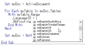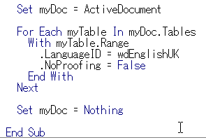 Sub Memsourceの言語設定を変更する() Dim myDoc As Document Dim myTable As Table Set myDoc = ActiveDocument For Each myTable In myDoc.Tables With myTable.Range .LanguageID = wdEnglishUS .NoProofing = False End With Next Set myDoc = Nothing End Sub