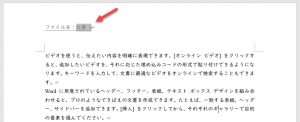 文書の最初のセクションのヘッダーにファイル名を挿入します。ファイル名はフィールドで入力するので、ファイル名を変更してフィールドを更新すればヘッダーの表示も変化します。