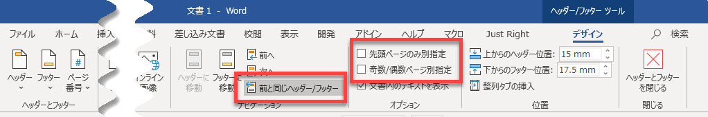 もし、特定のセクションで以下の赤枠で囲んだ項目を設定している場合(たとえば、「前と同じヘッダー/フッター」をオフにする場合)には、ヘッダーにファイル名が表示されない場合があります。