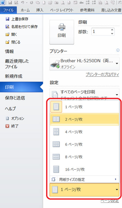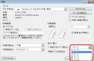 (1)「印刷」ダイアログボックスでA3用紙のあるプリンタードライバを選択して、印刷時の1枚当たりのページ数を設定します。