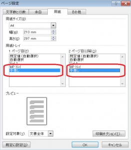 (2)「ページ設定」ダイアログボックスで、A3用紙が入っている用紙トレイを、1ページ目および2ページ目以降で選択します。