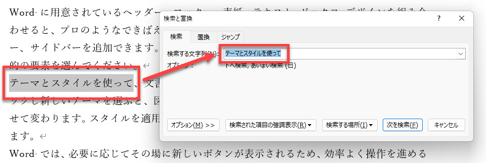(参考:【Word】[検索する文字列]欄に自動入力する場合としない場合の差)