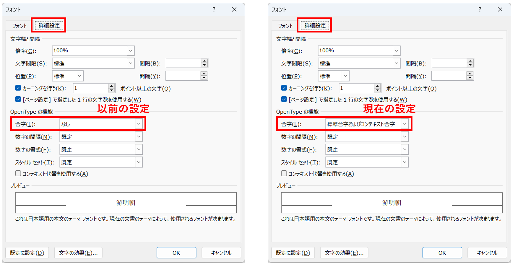 参考:Font.Ligatures プロパティ (Word) 外部記事