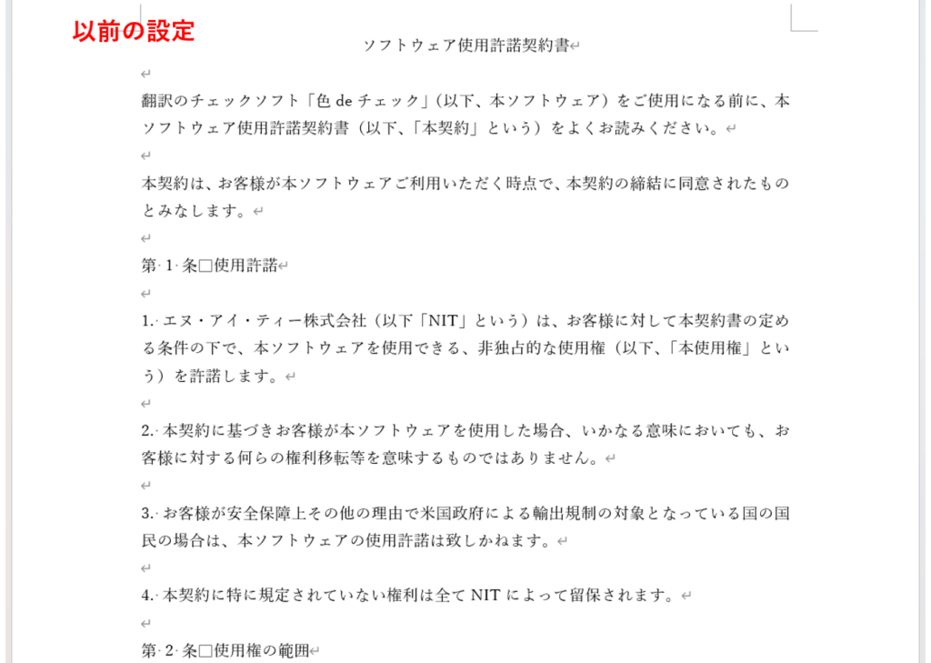 Sub NormalStyle_以前の設定() '標準スタイルを以前の設定にする With ActiveDocument.Styles(wdStyleNormal) '文字書式設定 With .Font .Size = 10.5 .Ligatures = wdLigaturesNone End With '段落書式設定 With .ParagraphFormat .SpaceAfter = 0 .LineSpacingRule = wdLineSpaceSingle .Alignment = wdAlignParagraphJustify End With End With End Sub