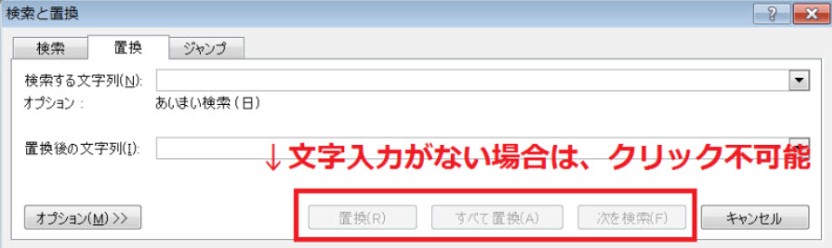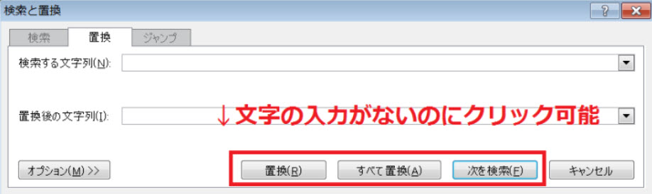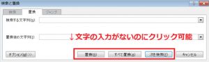 通常では、文字列が入力されていない場合には、「検索と置換」ダイアログボックスのボタンはクリックできないのに。。。