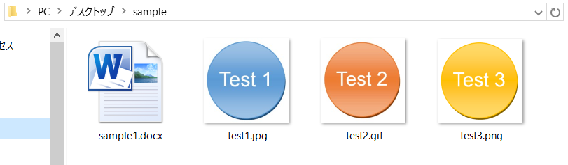 以下のようにsample1.docxファイルが保存されているフォルダ内に3つの画像ファイルが保存されています。test1.jpg, test2.gif, test3.pngと保存形式が異なります。