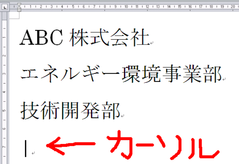 Sub 定型の文字入力マクロ_1() Selection.TypeText Text:="ABC株式会社" Selection.TypeParagraph Selection.TypeText Text:="エネルギー環境事業部" Selection.TypeParagraph Selection.TypeText Text:="技術開発部" Selection.TypeParagraph End Sub Sub 定型の文字入力マクロ_2() With Selection .TypeText Text:="ABC株式会社" .TypeParagraph .TypeText Text:="エネルギー環境事業部" .TypeParagraph .TypeText Text:="技術開発部" .TypeParagraph End With End Sub Sub 定型の文字入力マクロ_3() Selection.TypeText _ Text:="ABC株式会社" & vbCr & _ "エネルギー環境事業部" & vbCr & _ "技術開発部" & vbCr End Sub