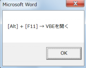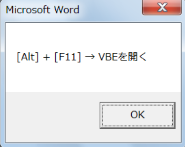 Sub メッセージボックス2() MsgBox "[Alt] + [F11] → VBEを開く" End Sub