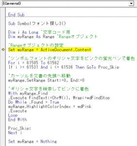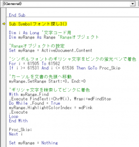 Dim i as Long... と Dim myRange as Range... の行は、変数を定義しているだけなので、具体的に実行する内容はないので、これはスキップ。