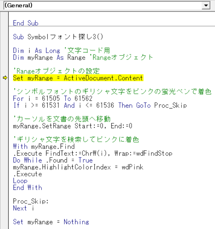この場合には、実行するプログラムが書かれた行まで移動するので、下図のとおり、Set myRange...まで移動します。