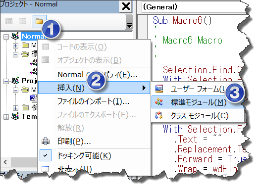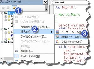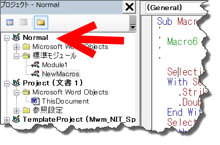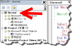 VBEを開いてプロジェクトエクスプローラーの一番上に記載されているのがNormalテンプレートです。