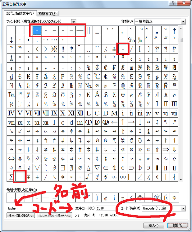 文字コードは、「記号と特殊文字」ダイアログボックスで取得できます。