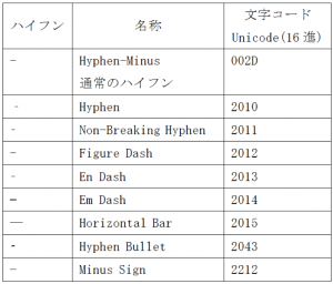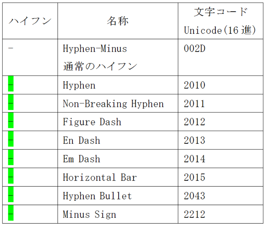 Hyphen、Non-Breaking Hyphen、Figure Dash、En Dash、Em Dash、Horizontal Bar、Hyphen Bullet、Minus Signといろいろあります。