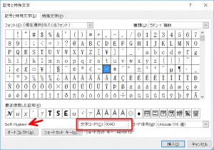 以下のように、[記号と特殊文字]ダイアログボックスにて、Soft HyphenのUnicode(16進)の文字コードを探します。
