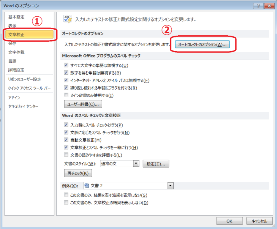 ①Word 2010でオートコレクトのダイアログボックスを開く:
