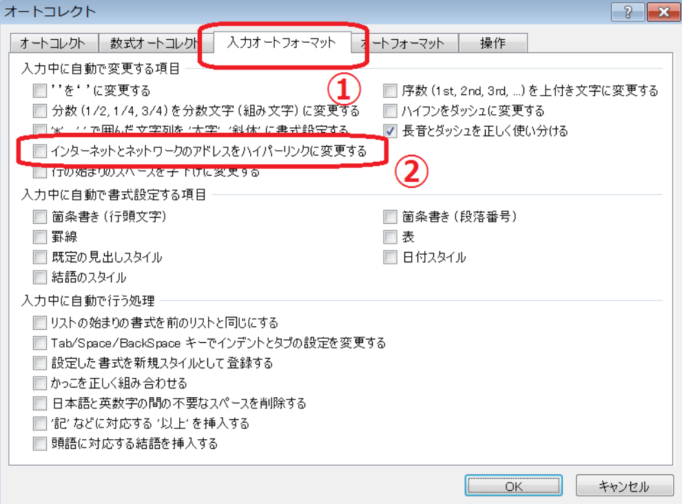開いたオートコレクトダイアログボックスにて、①「入力オートフォーマット」のタブを開き、②「インターネットとネットワークのアドレスをハイパーリンクに変更する」のチェックボックスをオフにします。