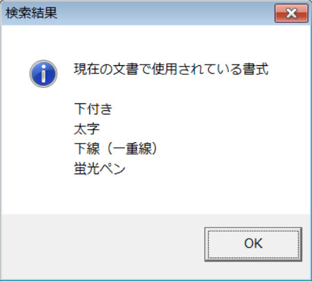 の書式を文書中から探し、使われている書式をメッセージボックスで表示します。