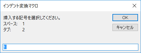 マクロを実行するとダイアログボックスが表示されます。インデントを全角スペースに変換する場合には1を、タブに変換する場合には2を入力して[OK]ボタンをクリックします。