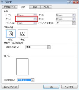 以下の画像では、セクション区切りをした2ページ目以降の左余白を1ページ目の余白よりも大きくした場合のページ設定の「余白」画面を示しています。
