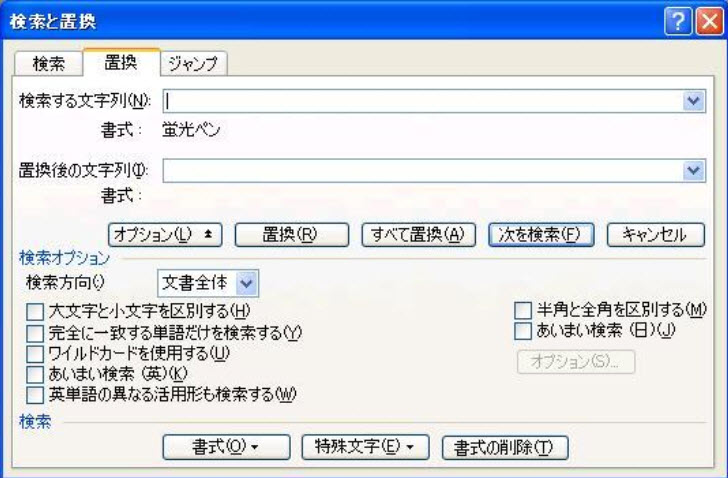 「検索と置換」ダイアログボックスでは、以下の通り、「蛍光ペン」というおおざっぱな条件で検索することしかできません。