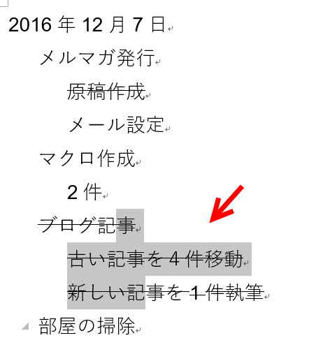 やっぱり、実施した項目が見えた方がよいかなと思いまして、実施済みの項目に取り消し線を引くマクロを作ってみました。