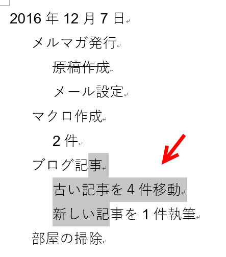 そのうち、実施した項目をCompleteという項目の下のレベルに自動で移動するマクロなんてものも作ってみました。