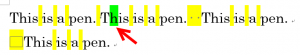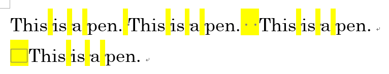 文書においてスペース以外の文字列を探し、見つかった場合にその文字列を蛍光ペンで着色してから上記のNo_HighLightのマクロを実行するのです。