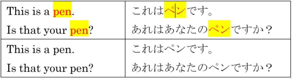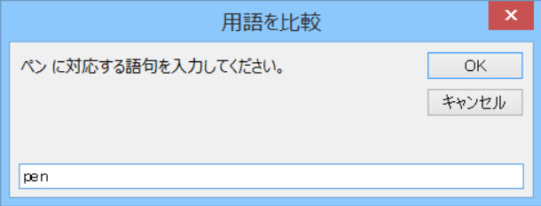 Sub 対訳表で比較() Dim myText1 As String Dim myText2 As String Dim myRange As Range 'カーソルが表内であれば、実行します。 If Selection.Information(wdWithInTable) = False Then MsgBox "2列以上の表内で実行してください。" Exit Sub End If '語句を選択します If Selection.Type = wdSelectionIP Then Set myRange = Selection.Range myRange.Expand wdWord myText1 = Trim(myRange.Text) Else myText1 = Trim(Selection.Text) End If 'Rangeオブジェクトにカーソルのある行を代入します Set myRange = Selection.Rows(1).Range 'Inputboxを使って、myText1 に代入した語句に '対応する語句を入力します myText2 = Trim(InputBox(myText1 & _ " に対応する語句を入力してください。", "用語を比較")) If myText2 = "" Then Exit Sub 'Find.HitHighlight メソッド を用いて 'myText1 と myText2 をハイライトします '英語の複数形もハイライトしたいので、 'MatchWholeWord:=False(部分一致)とします With myRange.Find .ClearHitHighlight .HitHighlight FindText:=myText1, _ HighlightColor:=wdColorYellow, _ TextColor:=wdColorRed, MatchWholeWord:=False .HitHighlight FindText:=myText2, _ HighlightColor:=wdColorYellow, _ TextColor:=wdColorRed, MatchWholeWord:=False End With Set myRange = Nothing End Sub